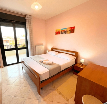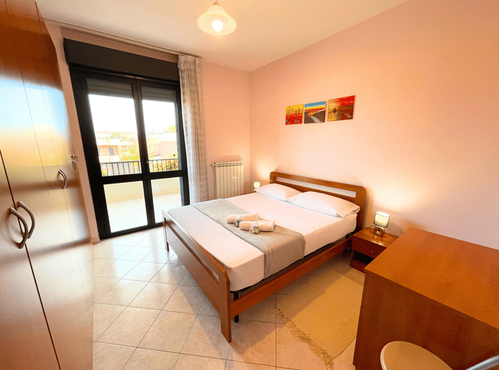 Al termine del corridoio si trova la camera matrimoniale padronale, dotata di un confortevole letto a due piazze e di un terrazzo privato, che conferisce ulteriore riservatezza e luminosità all’ambiente. L’abitazione dispone di un condizionatore posizionato nella zona giorno, mentre tutte le finestre sono dotate di zanzariere, garantendo comfort in ogni stagione.