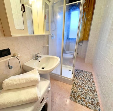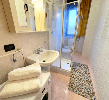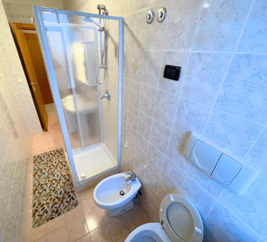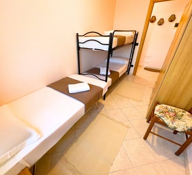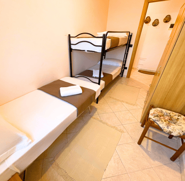 Attraverso il corridoio si raggiunge la prima camera da letto, dotata di un pratico letto a castello con due posti singoli e un ulteriore letto ad una piazza e mezza, perfetta per ospiti o famiglie. Proseguendo, si accede al bagno finestrato, completo di doccia, lavatrice, lavabo, bidet, WC e asciugacapelli.